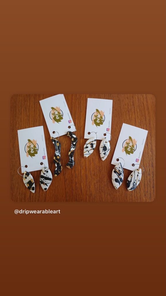 Pambula artist Amy Grealy has designed a series of up-purposed jeans as a response to the book To Heal a Lyrebird. Every pair is unique and responds to a certain section of the narrative. Amy’s talents do not just rest with paint designs but also with pottery. She has created a limited edition series of clay earrings and decor in gold-flecked grubby-style. Please follow @dripwearableart or email: amygrealy@live.com.au or items are available from Art Essence Gallery, Pambula.