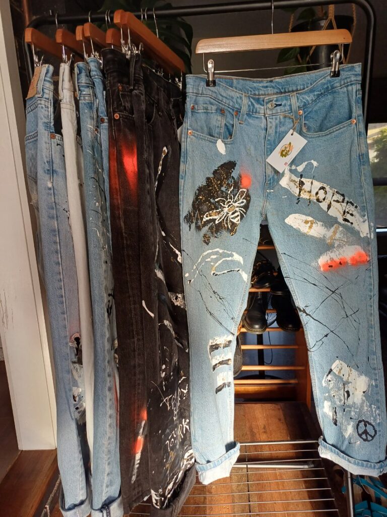 Pambula artist Amy Grealy has designed a series of up-purposed jeans as a response to the book To Heal a Lyrebird. Every pair is unique and responds to a certain section of the narrative. Amy’s talents do not just rest with paint designs but also with pottery. She has created a limited edition series of clay earrings and decor in gold-flecked grubby-style. Please follow @dripwearableart or email: amygrealy@live.com.au